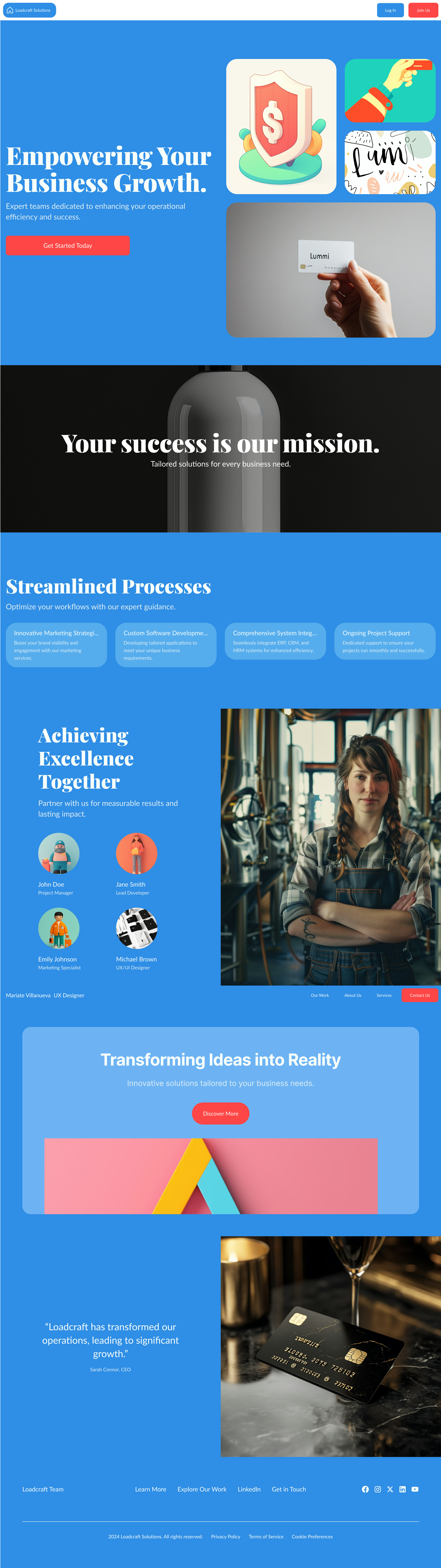 Prompt: Loadcraft corporate website with a bright minimalistic interface and elements with a bluer effect. The website is in white, the accent color is blue. The mission of the company: We provide your business with a team of experienced managers, analysts and performers with extensive experience, impeccable work ethic and well-established efficiency improvement mechanisms. A systematic approach and flexible methodologies, as well as instructions, scenarios and checklists for all occasions. Company services:marketing, Mobile application development, Website development, ERP, CRM, HRM systems development, project support and maintenance, and a brief description of each service. The company has achievements in numbers: 25 years on the market, 100 projects created, top 10, 100 awards received. There is a news block at the end of the site.
